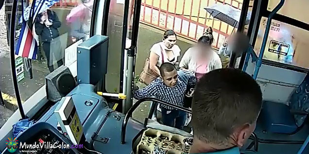 Tal y como se aprecia en la grabación, un hombre obstaculizó el paso de una señora que se disponía a abordar un autobús de la ruta Puriscal – San Juan; mientras dos mujeres aprovecharon para sustraerle la cartera del bolso que llevaba.
